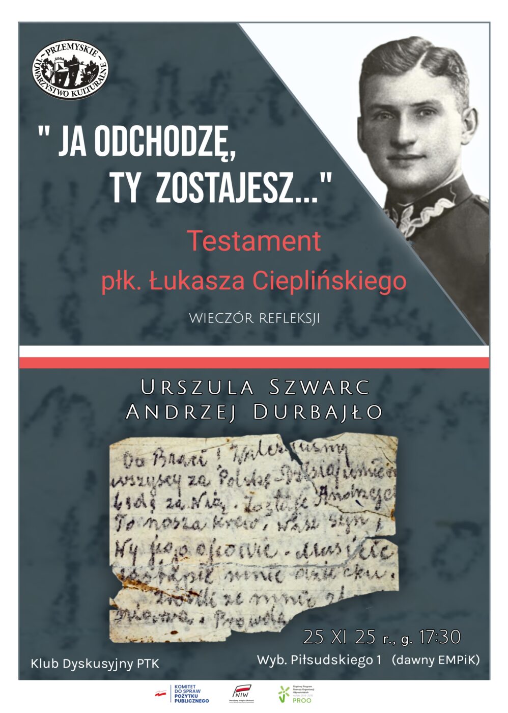 Serdecznie zapraszamy na wyjątkowy wieczór refleksji poświęcony testamentowi płk. Łukasza Cieplińskiego, zatytułowany „Ja odchodzę, Ty zostajesz…”.